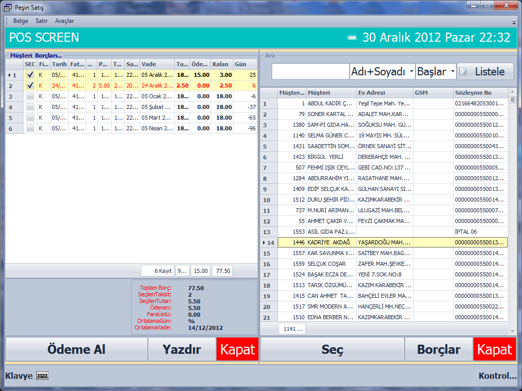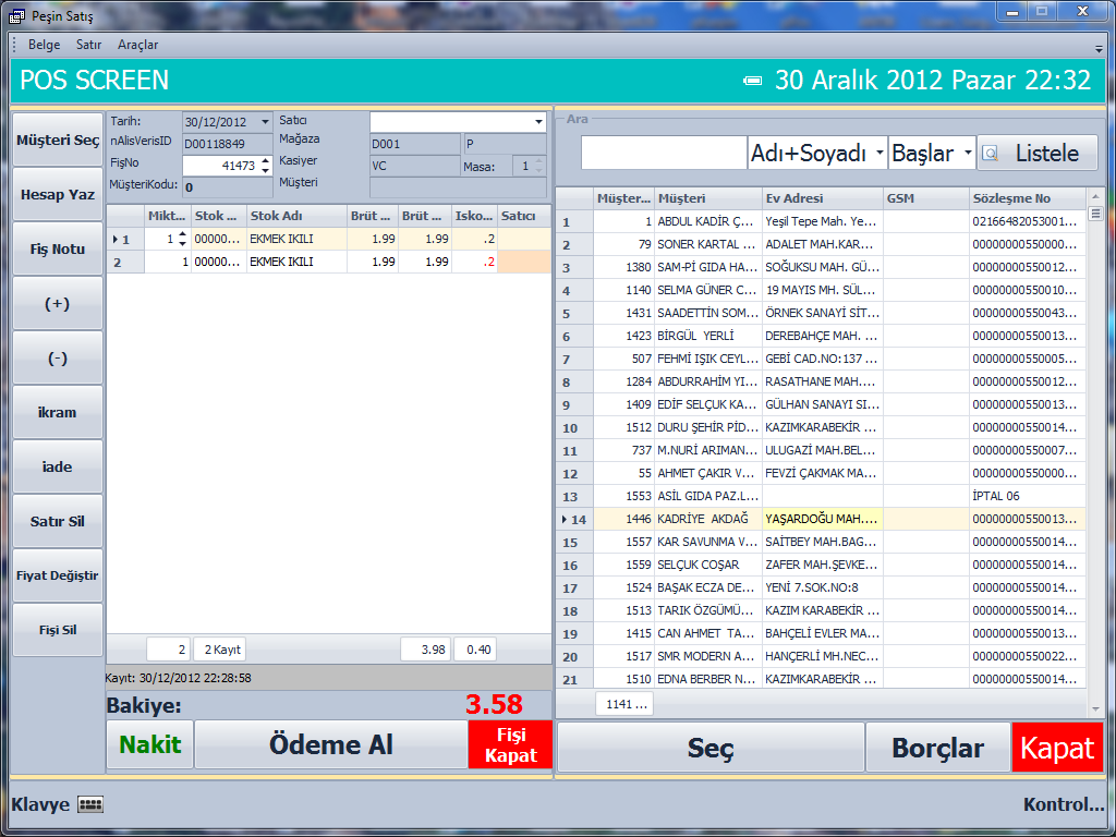 Dokunmatik Ekran Üzerinden, Peşin ve Açık Hesaba Satış Yapma, Satış Bekletme, Kolay Menü,Sanal Klavye, Fiş Yazdırma, Fatura Yazdırma ve Yazarkasadan fiş kesme.Teraziden Bilgi alma ve Tartılı ürün satışı.Menüden Satış, Tutara görme Miktar hesaplama,İskonto yapma , ikram verme. Puan ve Promosyon.Değişik Ödeme Türlerine göre Tahsilat yapma ve Veresiye yapma. Paraüstü Takibi ve Parçalı Tahsilat,Satıcı Takibi , Masa Takibi Veresiyeden tahsilat ve daha nice işlem ve raporlar